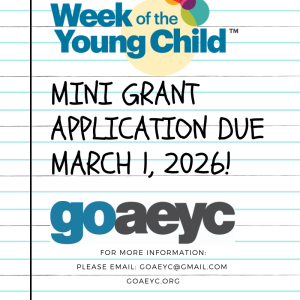 GoAEYC is proud to offer our membership an opportunity for a $100 Week of the Young Child Mini Grant. The Applications are due my March 1, 2026. Please let us know if you have any questions: goaeyc@gmail.com